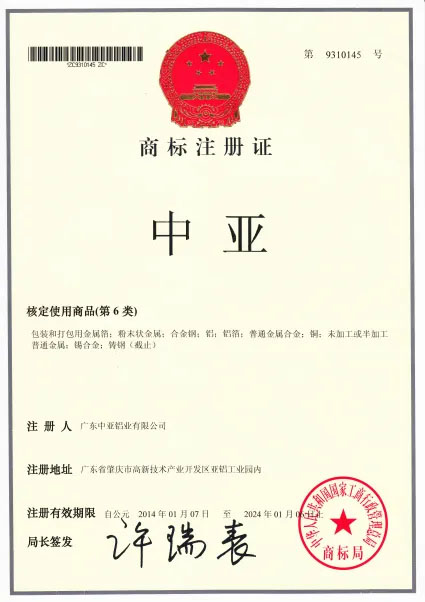 ▲廣東中亞鋁業(yè)有限公司廠標(biāo)注冊證