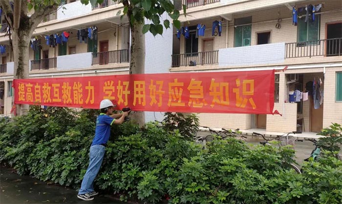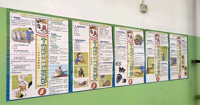 此外,我司在車間、飯?zhí)门c生活區(qū)張貼海報、橫幅,時刻向全體員工宣教安全知識,利用LED屏幕與多媒體投屏滾動播放安全守則、放映視頻動畫,增強(qiáng)全體員工的安全防范意識。